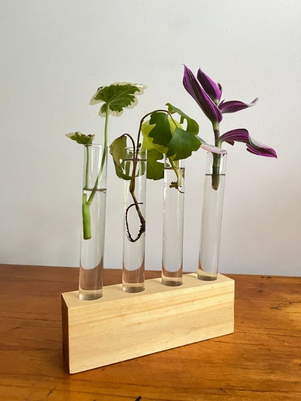 Nuestras estaciones de propagación combinan diseño y naturaleza: tubos de vidrio transparentes donde podés ver cómo nacen las raíces, montados en soportes que quedan perfectos en cualquier rincón de tu casa.
