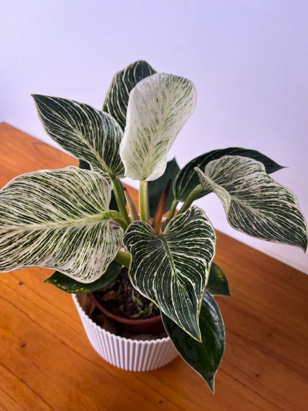Planta elegante y llamativa con hojas verdes oscuras adornadas por rayas y motas blancas que crean un contraste vibrante, ideal para interiores con luz media y decoración moderna.